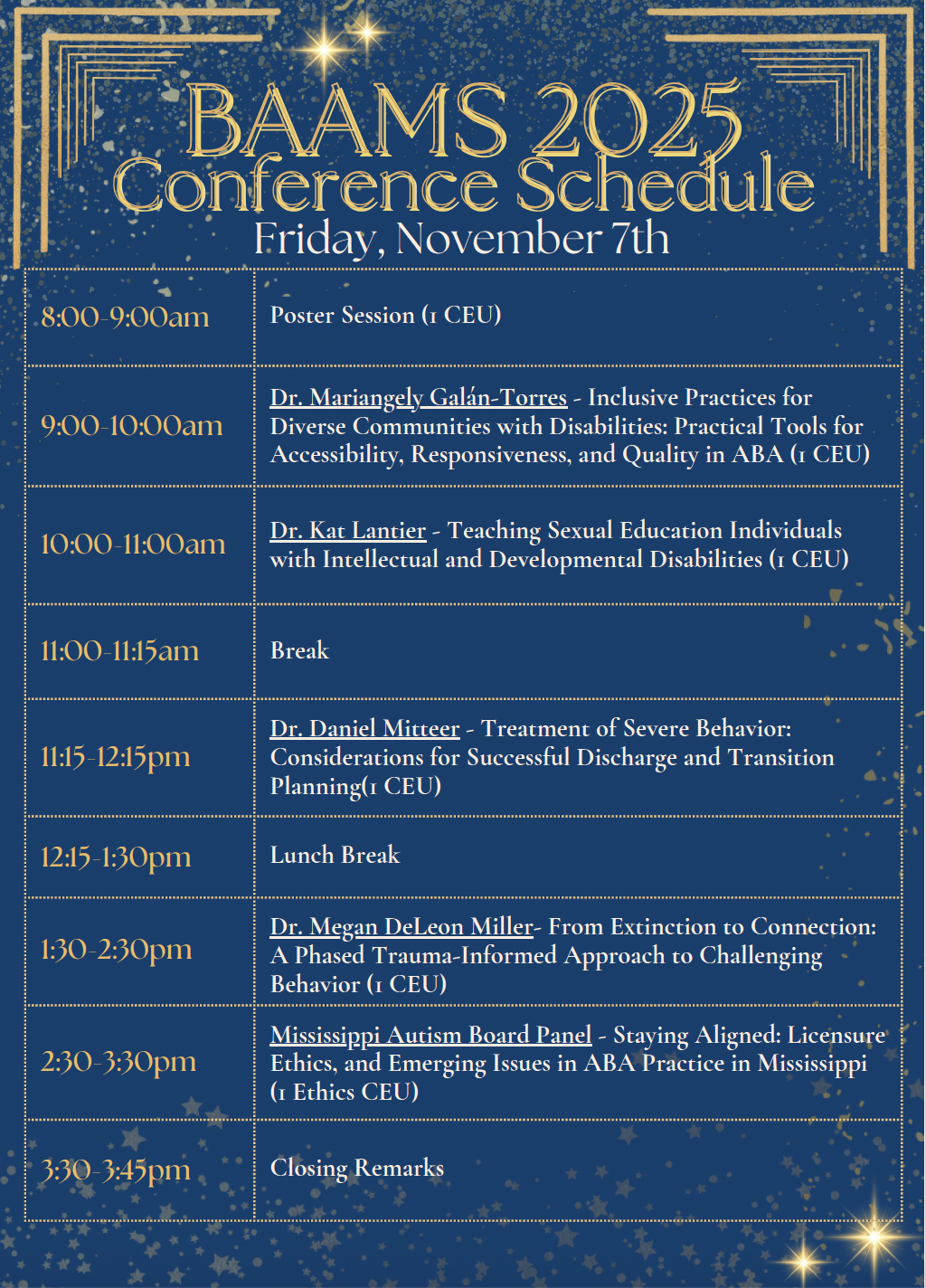 Upcoming Events More Events BAAMS 2025 Conference Registration Register Now Annual Conference 2025 We are so excited to see everyone at our Annual Conference on November 6th & 7th, 2025 at The Riley Center in Meridian, Mississippi! BAAMS 2025 Conference Registration Register Now